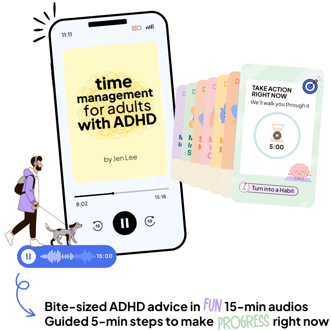 Turn feeling overwhelmed, into feeling empowered, with on-demand advice → fun, 15-min audio bursts from ADHD & self-improvement experts.